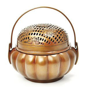 這個(gè)暖手爐,呈南瓜形,紫銅制作,高4.1厘米,腹徑6.2厘米,做工卻精細(xì)考究。這種古代手爐一般都是由爐身、爐底、爐蓋和提梁(提柄)組成,爐底多有平底、凹底、荸薺底等,提梁常常設(shè)計(jì)成弧形柄、花紋柄、花籃柄、折角柄、竹節(jié)柄等。手爐型制各式各樣,還有圓形、八角形、方形、腰形、花籃形、海棠形等。手爐爐蓋和爐身亦多刻有“喜上眉梢”“竹報(bào)平安”“福祿壽”等吉祥喜氣的圖案。別看手爐不顯眼,里面放進(jìn)炭火或尚有余熱的灶灰,走到哪兒都可暖手。其藝術(shù)設(shè)計(jì)也自有其妙,細(xì)賞頗能悅心。