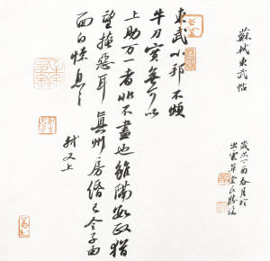 為糾正習(xí)書過程中用筆流滑、結(jié)字流俗的弊端,葛良勝尤其重視碑、帖結(jié)合,從初習(xí)唐楷到轉(zhuǎn)工行草,他既師法二王,浸淫《書譜》,又對《張黑女》、《張猛龍》以及《龍門二十品》進行臨習(xí)。葛良勝還在對篆書《石鼓文》、隸書《好大王碑》大量研習(xí)的同時,涉獵篆刻,使筆下的線條更加古厚凝練,更加豐富而不單調(diào)。因為葛良勝確信“透過刀鋒見筆痕”,學(xué)習(xí)過篆刻的人,當更加了解刀石的特性,更容易透過碑拓的刀鋒看筆鋒,同樣,篆刻也講究臨習(xí)古印,這與書法的學(xué)習(xí)過程是一樣的。