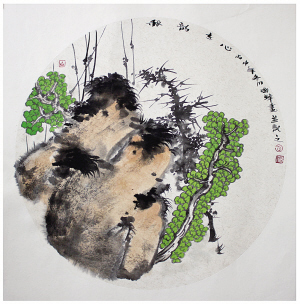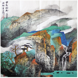 他在李唐的“小斧劈”、 王蒙的“披麻解索”等中不斷探索,表現(xiàn)手法豐富,技法全面。而細品其作品,構圖講究,色彩豐富而不雜亂,簡單而不單調(diào)。他著力以多變的畫面顏色來展示他心中的山水,努力使物象和動態(tài)達到統(tǒng)一,讓人與自然彰顯和諧。