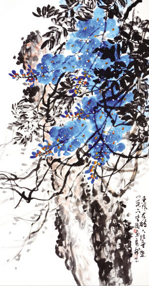 李俊的理論思考,直接影響、指導(dǎo)著他的創(chuàng)作實(shí)踐。品賞李俊的中國畫紫藤,顯然他的書法在畫法中得到了盡情的施展,其用筆上,既堅(jiān)持了陳大羽先生的雄健、利索,又有李俊自己的書體筆法,書寫之形象:點(diǎn)花如墜石,藤條時(shí)而狂草,時(shí)而行,時(shí)而楷,出枝時(shí)而篆時(shí)而隸,使作品呈現(xiàn)出雄邁氣勢(shì)。